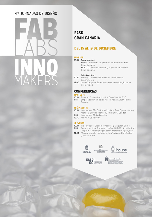 Por las mañanas, se realizaron conferencias de la mano de: Pierluigi Cattermole, director de la revista Experimenta; José Corujeira, especialista en Metodología de la Creatividad; Matías González de la ULPGC, especialista en Turismo Sostenible; Marco Vaginini, de ISIA Roma Design, de Emprendeduría Social; Carlos Viña, Juan Fco. Ojeda, Marian Alonso, David Lozano (3D Print Show London), y "La Fabrika", en Impresión 3D, y Arduino; Giocomo Vaccari, en videojuegos; José Domingo Núñez, de Arquitectura en ULPGC, en Recycling; Álvaro Hernández y Néstor Viña, en Cream-on y realidad virtual.