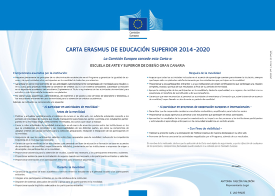 La ESCUELA DE ARTE y SUPERIOR DE DISEÑO GRAN CANARIA ha recibido la Carta Erasmus de Educación Superior (ECHE) en la convocatoria 2014, que será válida durante la vigencia del Programa Erasmus+ (2014-2020).